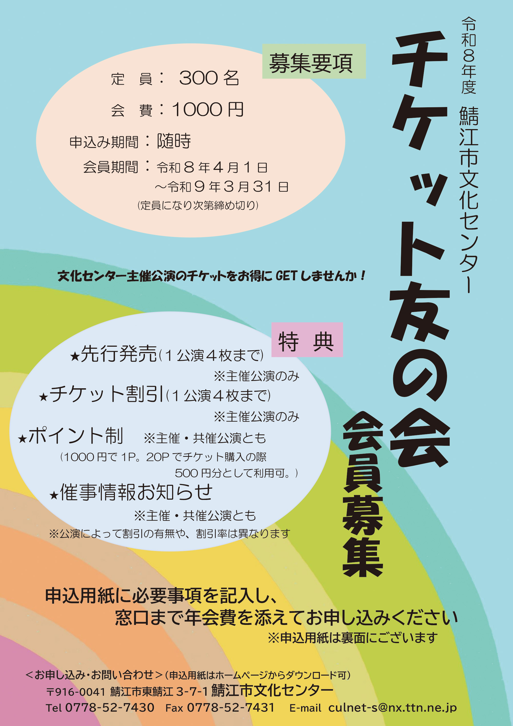鯖江市文化センターの窓口にて申込み用紙にご記入のうえ、年会費を添えてお申し込みください